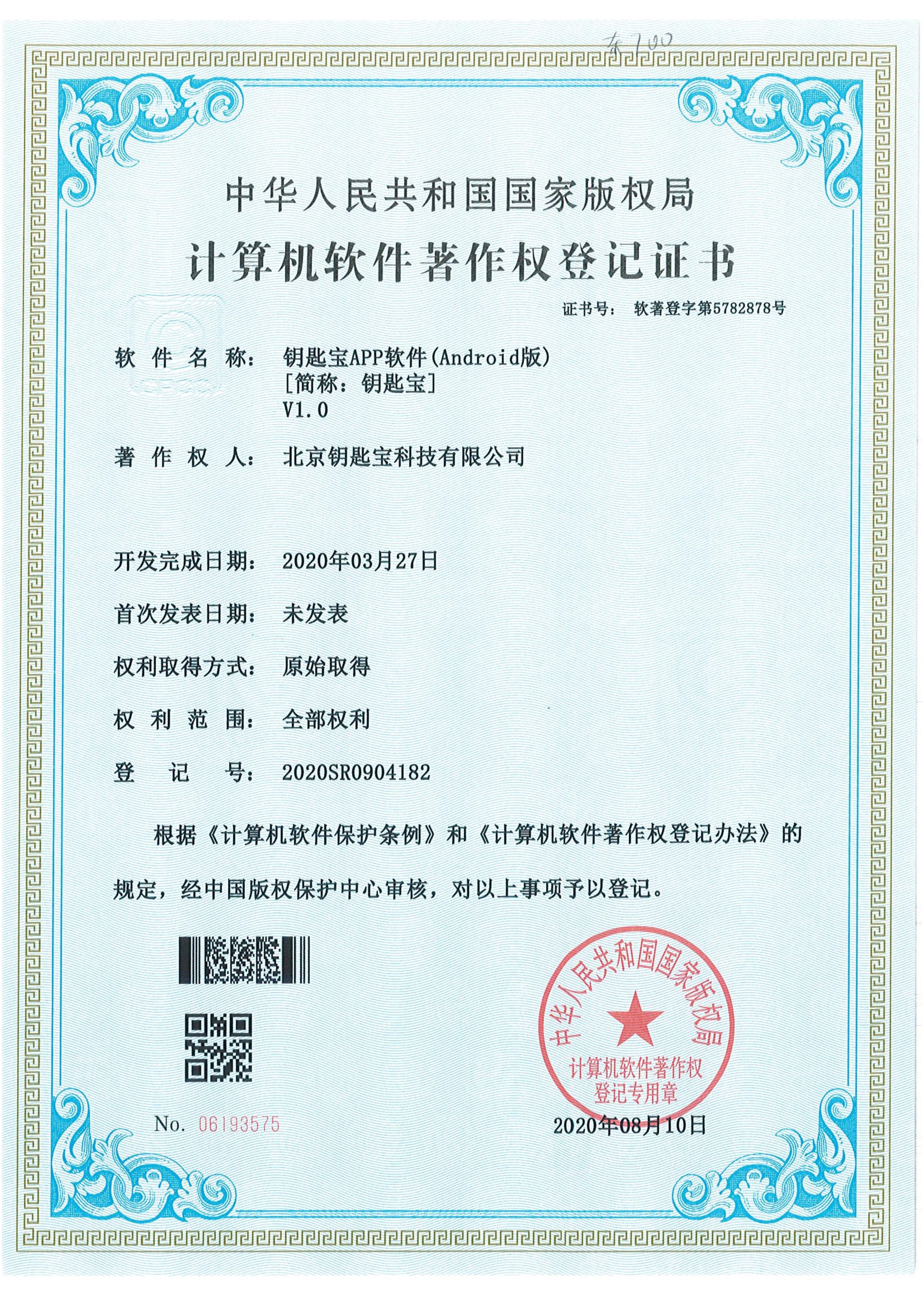 2020年(nian)3月27日北(bei)京鑰(yao)(yao)匙寶(bao)科技有(you)限(xian)公司取得了鑰(yao)(yao)匙寶(bao)APP軟件計算機(ji)軟件著作權登記證書(shu)